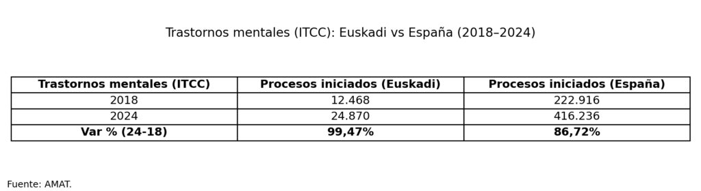 AMAT advierte, en definitiva, de un cambio de ciclo. Ya no se trata de un repunte puntual: los trastornos mentales se están convirtiendo en uno de los grandes motores del absentismo por contingencia común, con una tendencia al alza que, en Euskadi, avanza a mayor ritmo que en el conjunto de España.