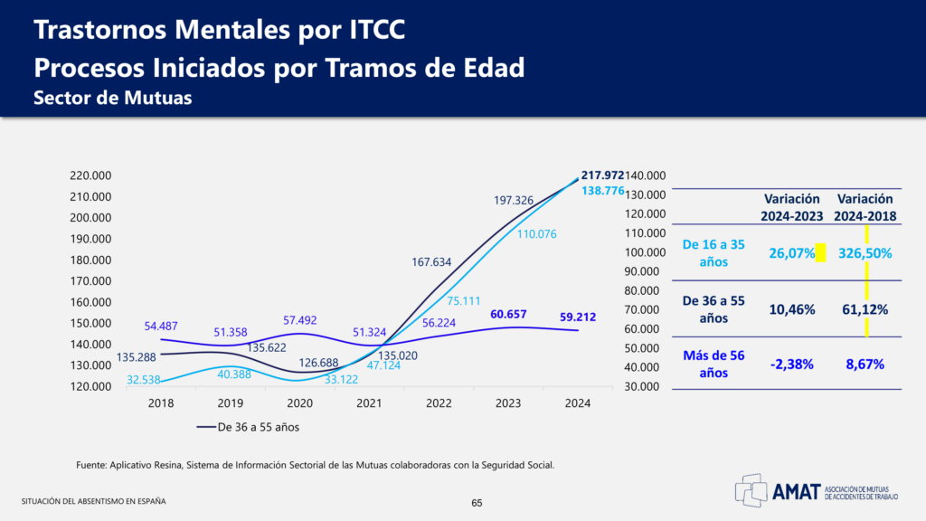 Pero el dato que más llama la atención por su velocidad es el componente generacional. En el conjunto de España, los procesos vinculados a trastornos mentales entre los 16 y 35 años aumentan un 326,5% entre 2018 y 2024. Solo en el último año analizado (2024 respecto a 2023), este tramo registra un incremento del 26,07%. En paralelo, el grupo de 36 a 55 años sube un 61,12% en el periodo 2018-2024 (10,46% interanual), mientras que en mayores de 56 años el crecimiento es mucho más moderado (8,67% desde 2018) e incluso cae en el último año (-2,38%).